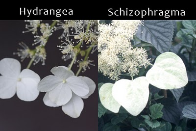 Distinguono questa Schizophragma: le infiorescenze, più 'cariche' e ramificate, con brattee più allungate, e il fogliame dal margine liscio.