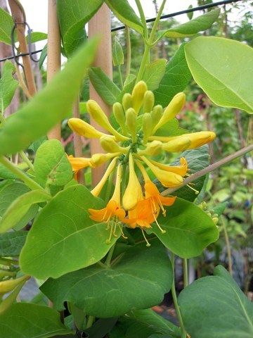 Rampicante volubile, decidua o semisempreverde; foglie appaiate, blu-verdi lunghe sino a 8 cm. Da giugno a settembre produce lunghi fiori a tromba, gialli, persistenti, bilabiati. Bacche rosso-arancio. Altezza 4 mt.