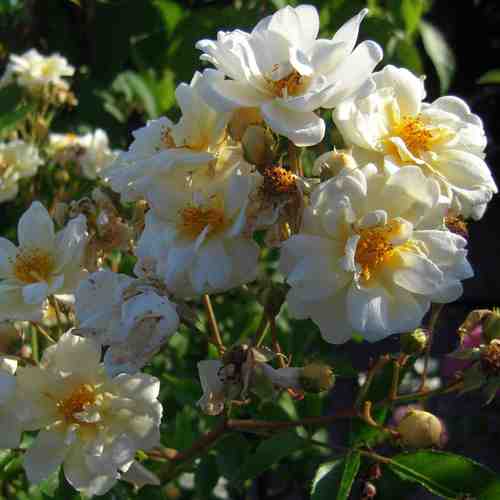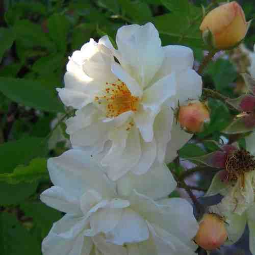 Fogliame deciduo, lucido, verde scuro. La fioritura è continua, a fiori bianchi doppi, quartati, intensamente profumati.