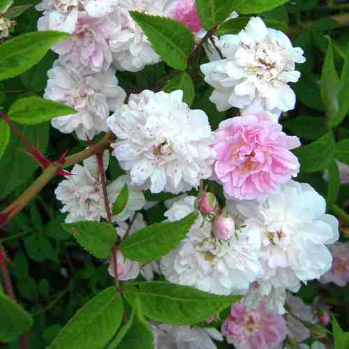 Fogliame deciduo, verde chiaro. La fioritura è continua, fiori semplici bianco-rosati, profumati.