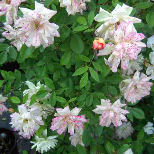 Fogliame deciduo, verde chiaro. La fioritura è continua, i fiori sono a mazzetti, virano dall’albicocca al bianco ed infine sono screziati di rosa.