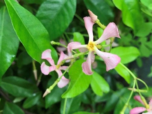 Distinguono questo Trachelospermum: fioritura rosa chiaro.