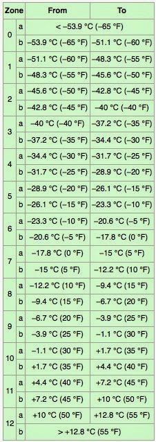 Di seguito una tabella riepilogativa di tutte le zone USDA.